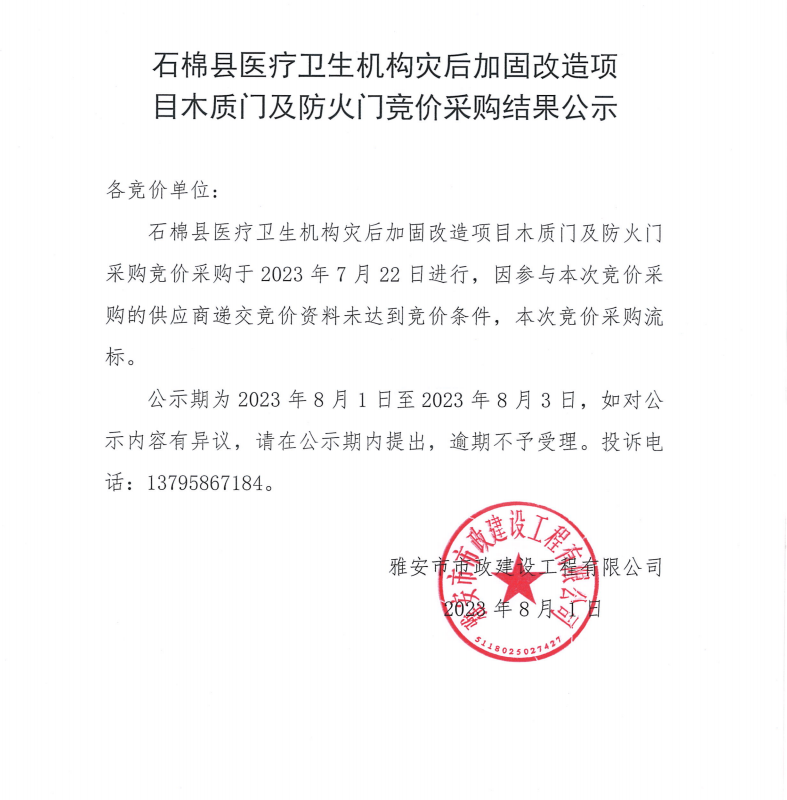 石棉縣醫(yī)療衛(wèi)生機構災后加固改造項目木質門及防火門競價采購結果公示