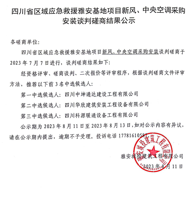 四川省區(qū)域應(yīng)急救援雅安基地項(xiàng)目新風(fēng)、中央空調(diào)采購(gòu)安裝談判磋商結(jié)果公示