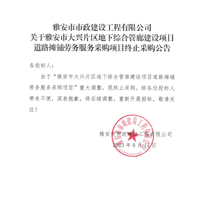 雅安市市政建設工程有限公司關于雅安市大興片區(qū)地下綜合管廊建設項目道路攤鋪勞務服務采購項目終止采購公告