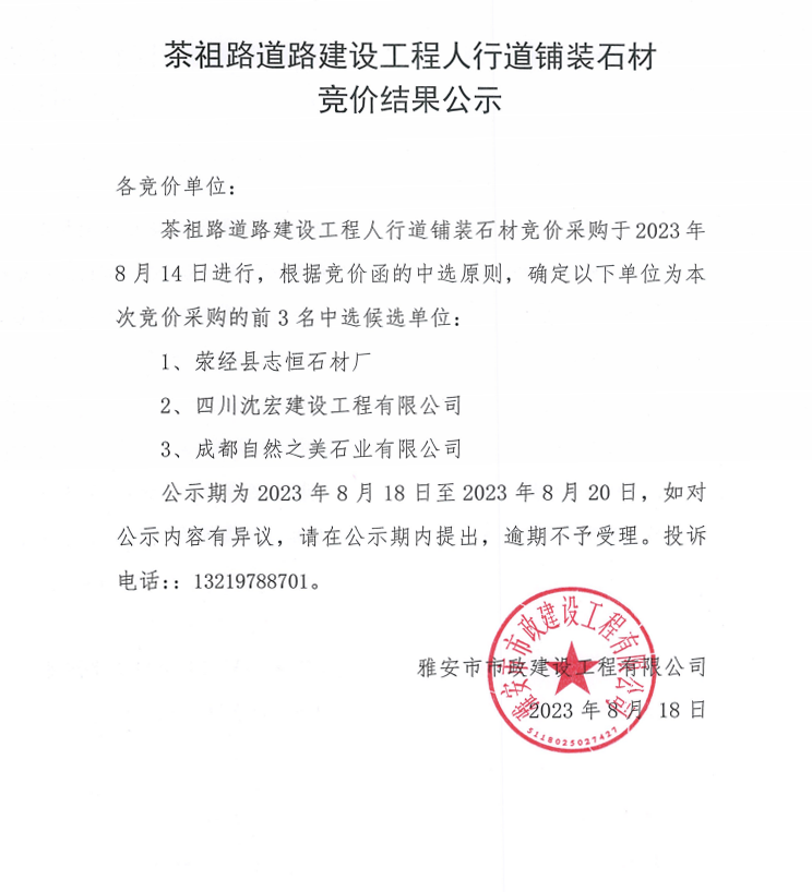 茶祖路道路建設(shè)工程人行道鋪裝石材競價(jià)結(jié)果公示