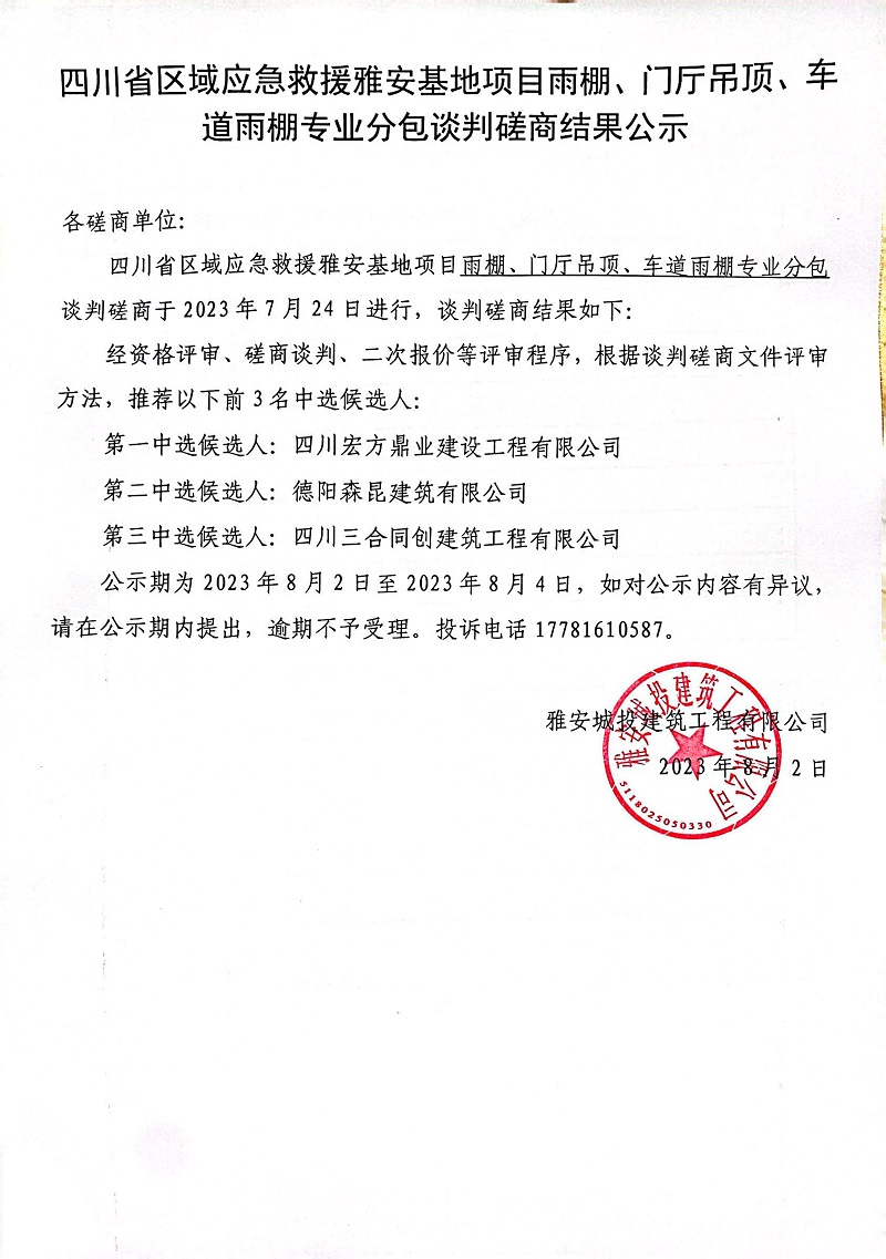 四川省區(qū)域應(yīng)急救援雅安基地項(xiàng)目雨棚、門廳吊頂、車道雨棚專業(yè)分包談判磋商結(jié)果公示