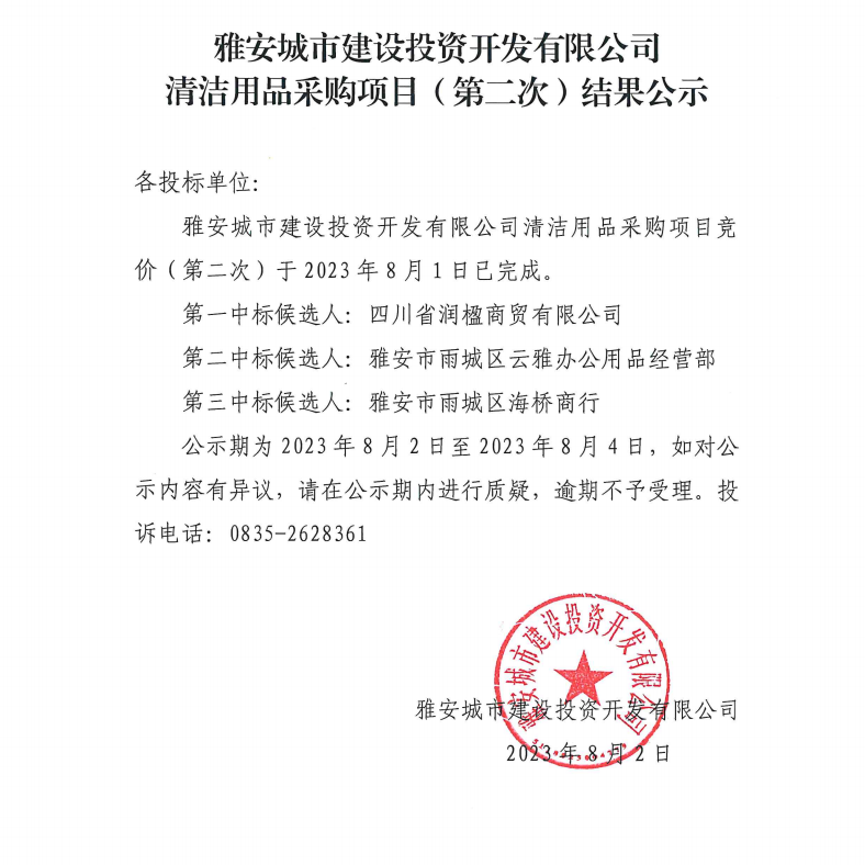 雅安城市建設(shè)投資開發(fā)有限公司清潔用品采購項(xiàng)目(第二次)結(jié)果公示