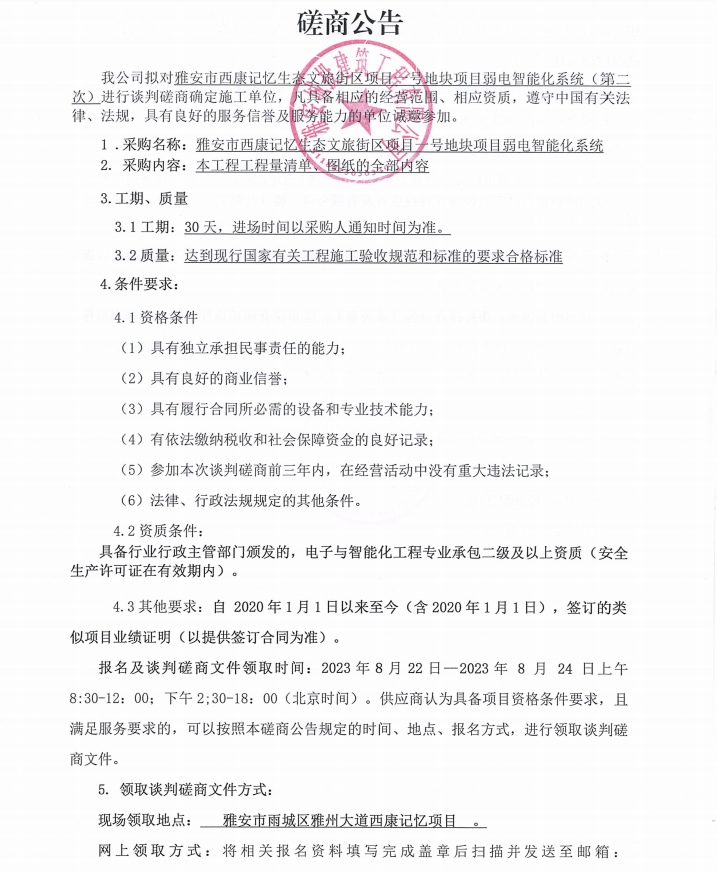 雅安市西康記憶生態(tài)文旅街區(qū)項目一號地塊項目弱電智能化系統(tǒng)(第二次)談判磋商公告