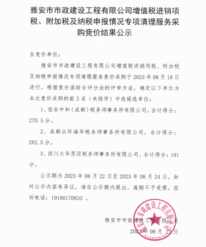 雅安市市政建設(shè)工程有限公司增值稅進(jìn)銷項(xiàng)稅、附加稅及納稅申報(bào)情況專項(xiàng)清理服務(wù)采購(gòu)競(jìng)價(jià)結(jié)果公示
