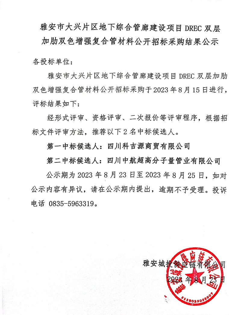 雅安市大興片區(qū)地下綜合管廊建設(shè)項目DREC雙層加肋雙色增強(qiáng)復(fù)合管材料公開招標(biāo)采購結(jié)果公示