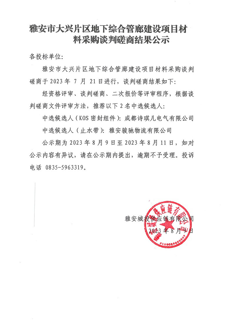 雅安市大興片區(qū)地下綜合管廊建設項目材料采購談判磋商結(jié)果公示