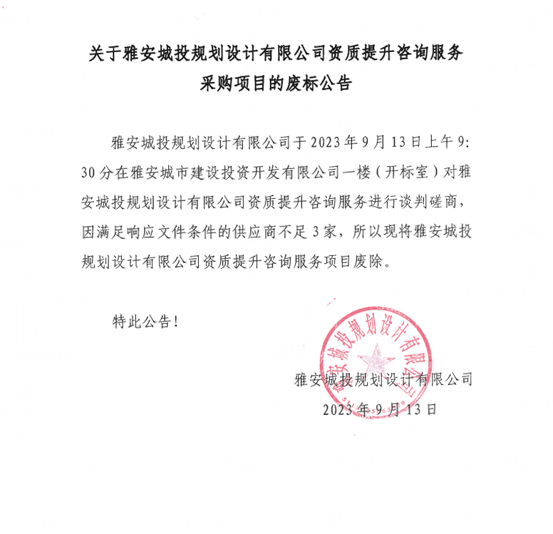 關(guān)于雅安城投規(guī)劃設(shè)計(jì)有限公司資質(zhì)提升咨詢服務(wù)采購項(xiàng)目的廢標(biāo)公告