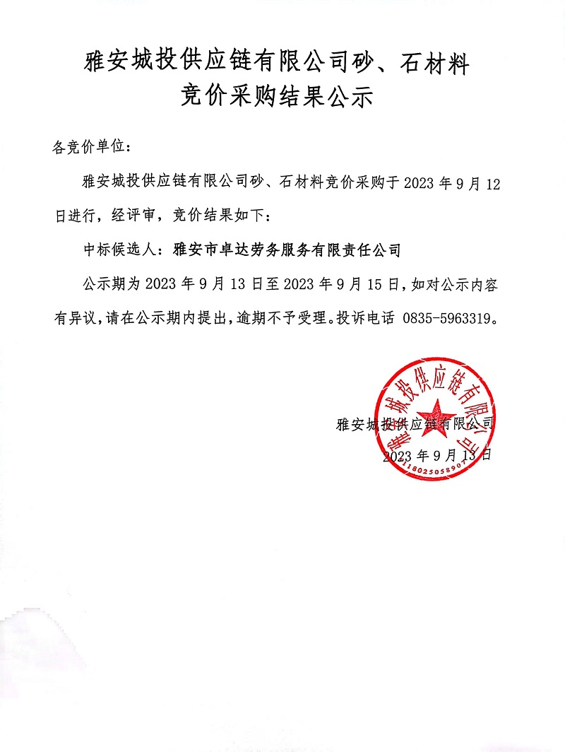雅安城投供應(yīng)鏈有限公司砂、石材料競(jìng)價(jià)采購結(jié)果公示