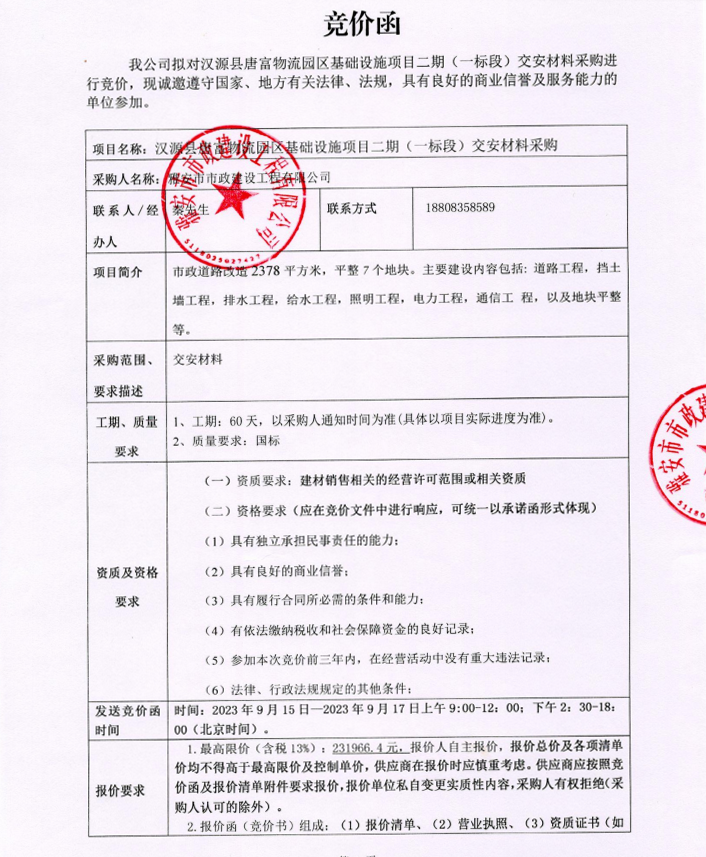 漢源縣唐富物流園區(qū)基礎(chǔ)設(shè)施項(xiàng)目二期(一標(biāo)段)交安材料采購(gòu)競(jìng)價(jià)公告