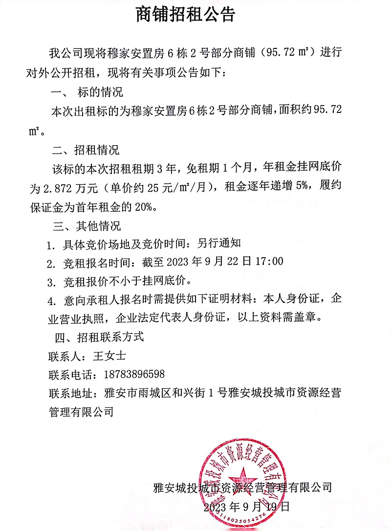 穆家安置房6棟2號部分商鋪招租公告