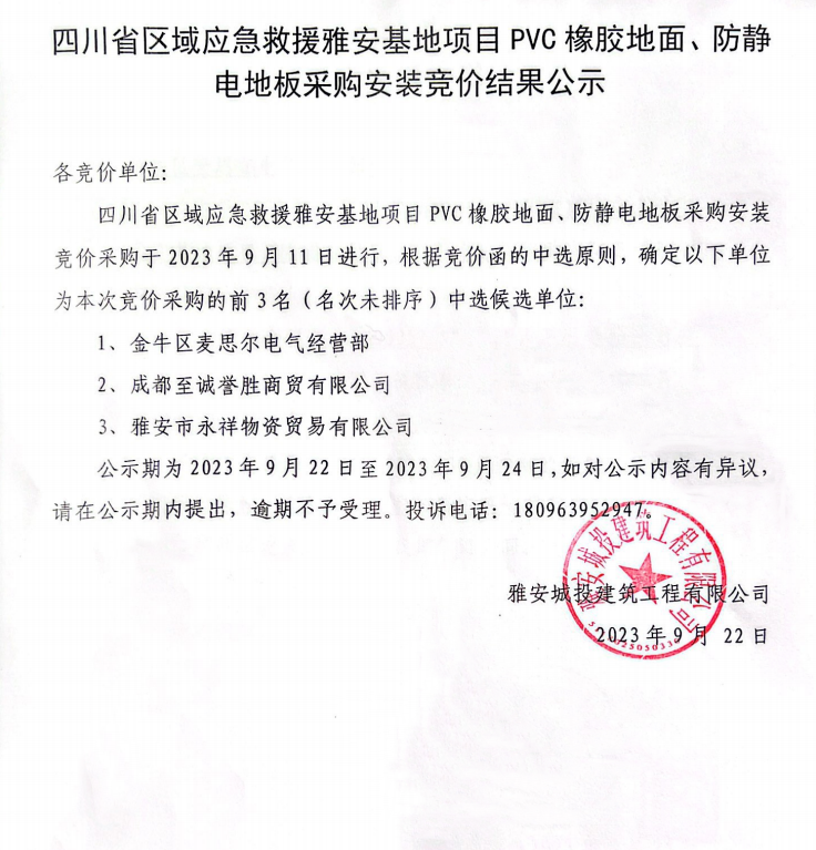 四川省區(qū)域應急救援雅安基地項目PVC橡膠地面、防靜電地板采購安裝競價結果公示