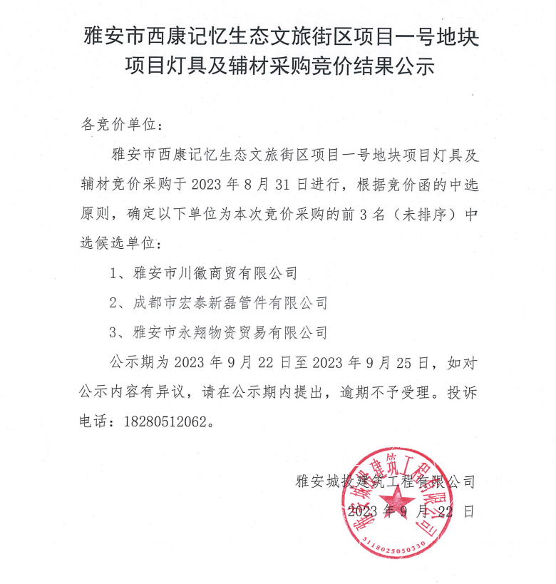 雅安市西康記憶生態(tài)文旅街區(qū)項目一號地塊項目燈具及輔材采購競價結果公示