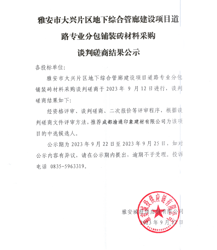 雅安市大興片區(qū)地下綜合管廊建設(shè)項目道路專業(yè)分包鋪裝磚材料采購談判磋商結(jié)果公示