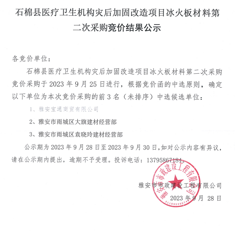 石棉縣醫(yī)療衛(wèi)生機(jī)構(gòu)災(zāi)后加固改造項(xiàng)目冰火板材料第二次采購競價(jià)結(jié)果公示