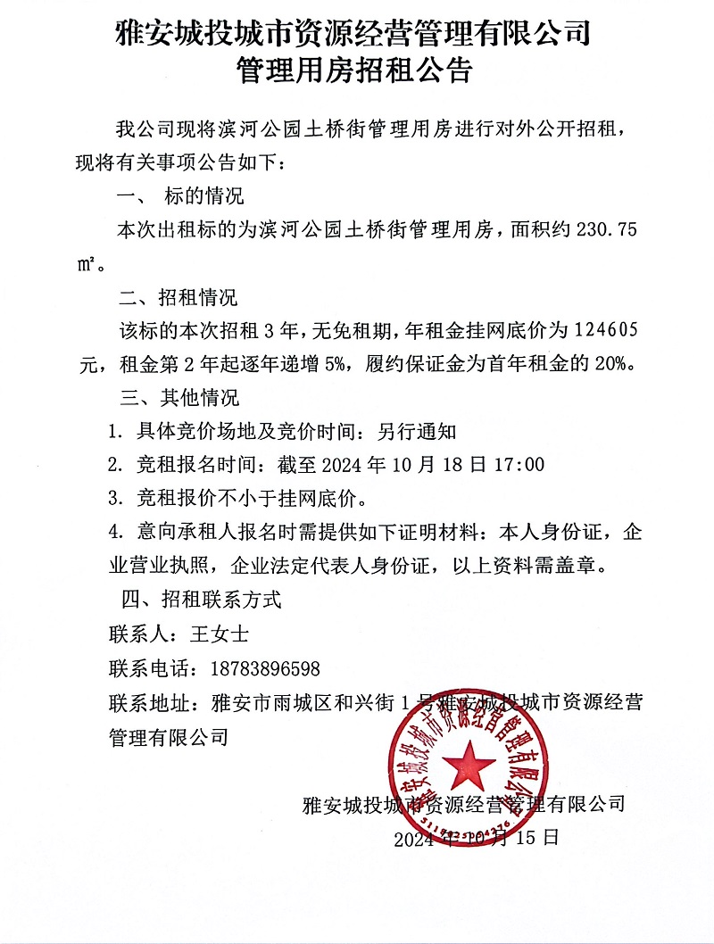 雅安城投城市資源經(jīng)營管理有限公司關于濱江公園土橋街管理用房招租的公告