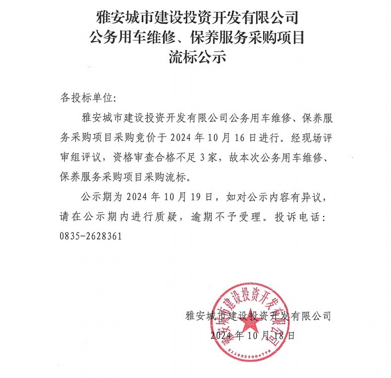雅安城市建設(shè)投資開(kāi)發(fā)有限公司公務(wù)用車維修、保養(yǎng)服務(wù)采購(gòu)項(xiàng)目流標(biāo)公示