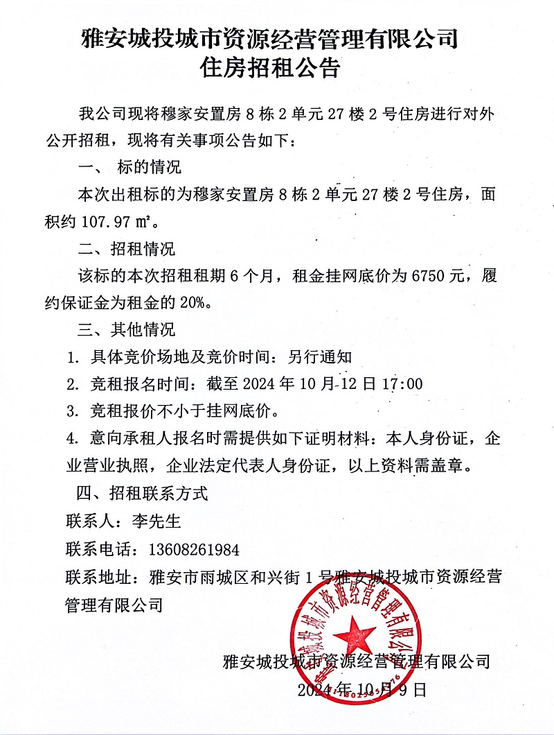 雅安城投城市資源經(jīng)營管理有限公司關于穆家安置房8棟2單元27樓2號住房招租公告