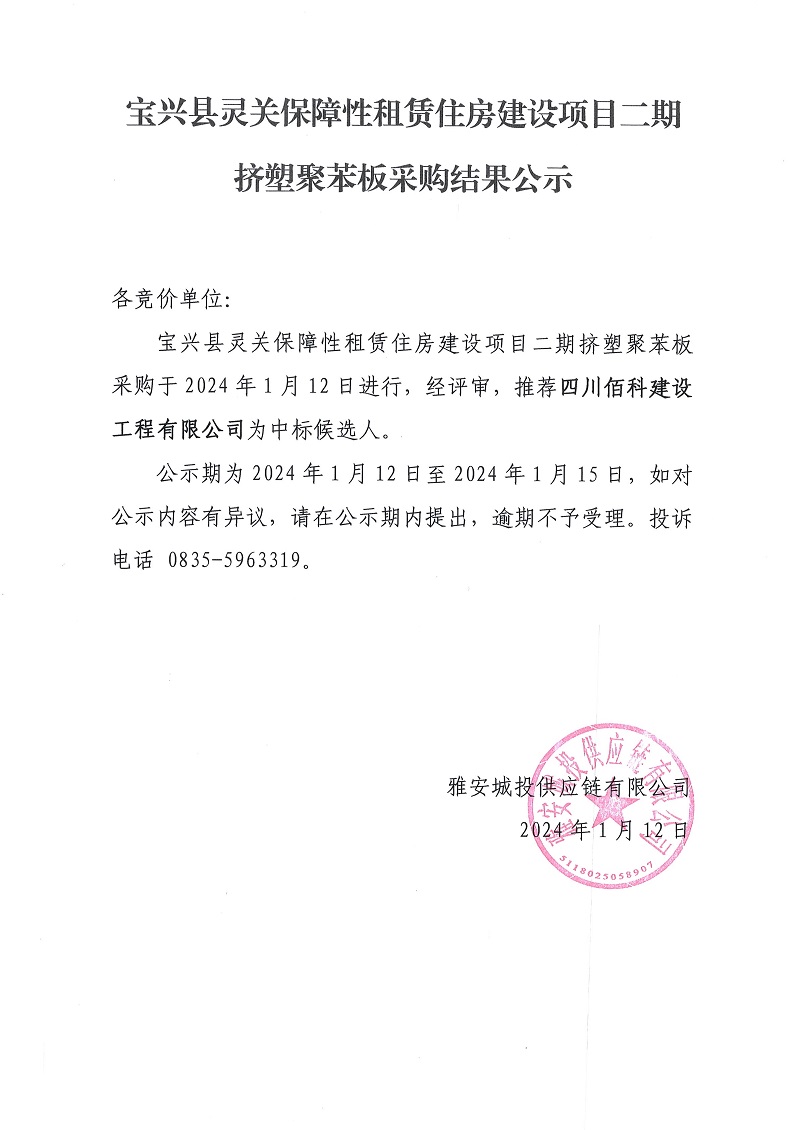 寶興縣靈關保障性租賃住房建設項目二期技塑聚苯板采購結果公示