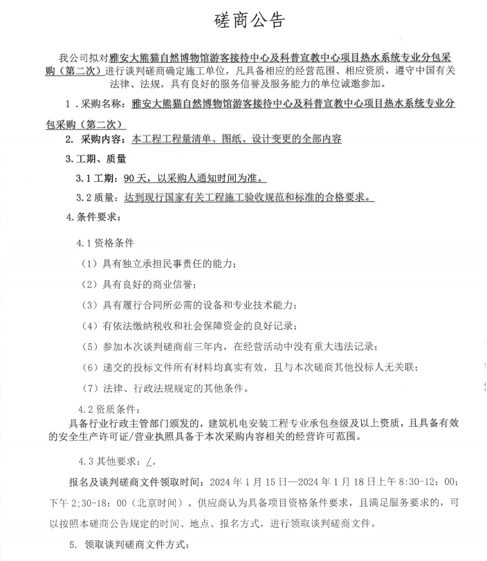 雅安大熊貓自然博物館游客接待中心及科普宣教中心項(xiàng)目熱水系統(tǒng)專業(yè)分包采購(第二次)磋商公告