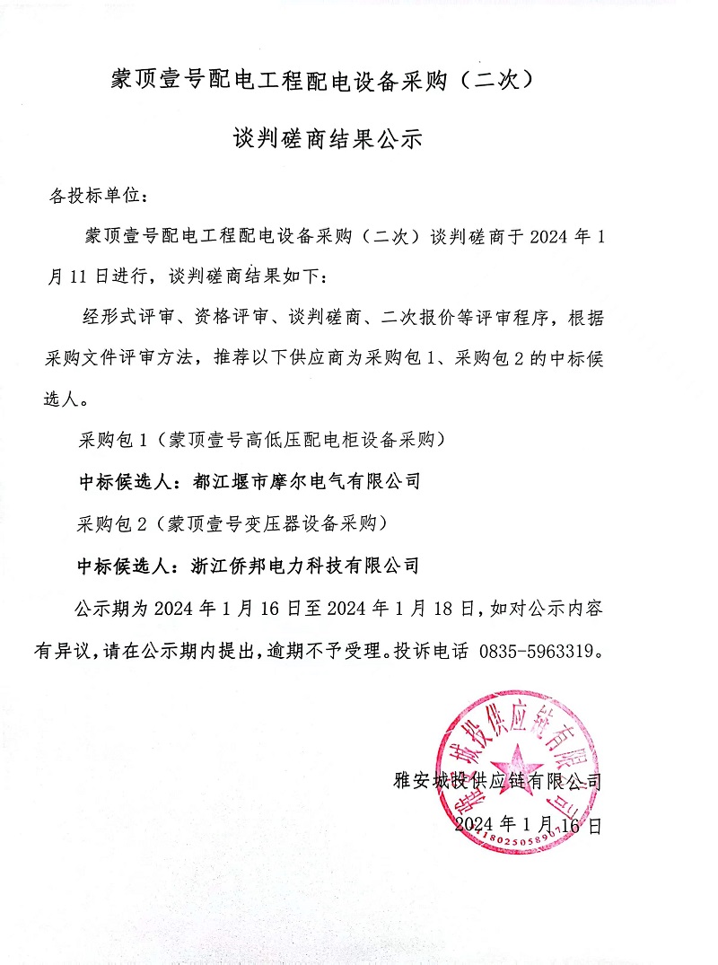 蒙頂壹號配電工程配電設(shè)備采購(二次)談判磋商結(jié)果公示