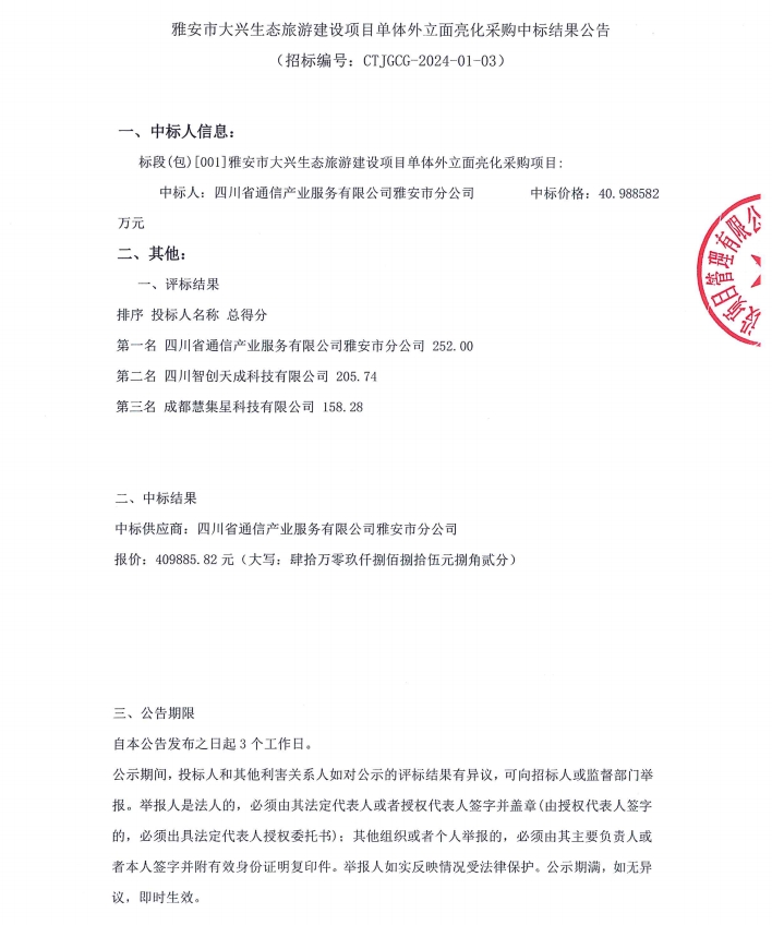 雅安市大興生態(tài)旅游建設(shè)項(xiàng)目單體外立面亮化采購中標(biāo)結(jié)果公告