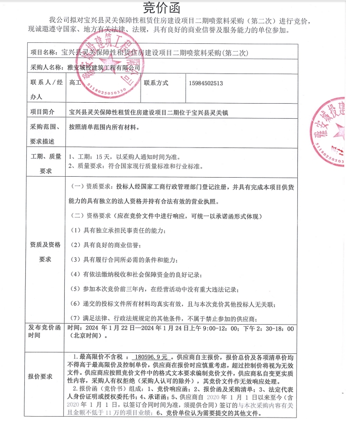 寶興縣靈關(guān)保障性租賃住房建設(shè)項(xiàng)目二期噴漿料采購(第二次)競(jìng)價(jià)公告