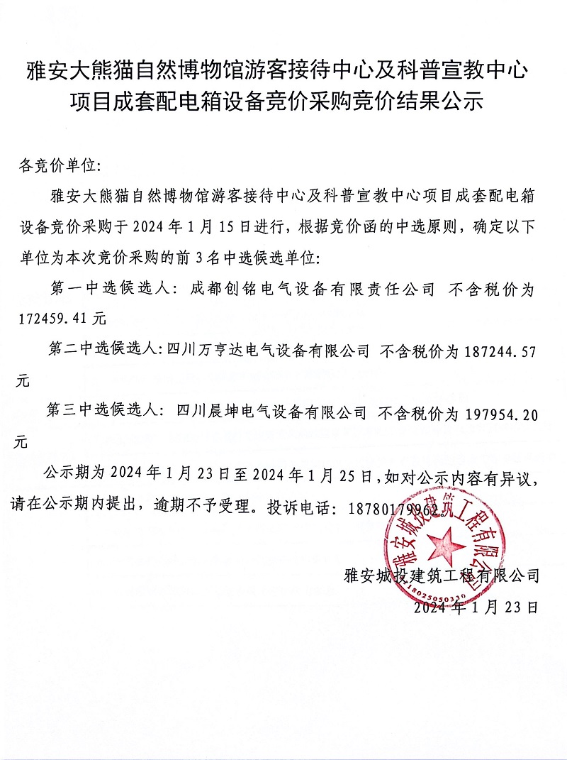 雅安大熊貓自然博物館游客接待中心及科普宣教中心項(xiàng)目成套配電箱設(shè)備競價(jià)采購競價(jià)結(jié)果公示