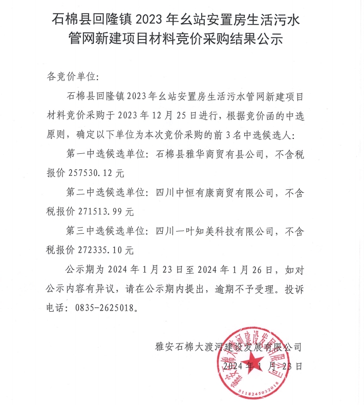石棉縣回隆鎮(zhèn)2023年幺站安置房生活污水管網(wǎng)新建項目材料競價采購結(jié)果公示