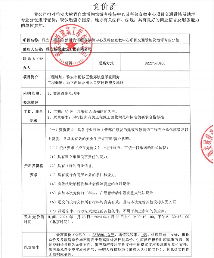 雅安大熊貓自然博物館游客接待中心及科普宣教中心項(xiàng)目交通設(shè)施及地坪專業(yè)分包競價公告