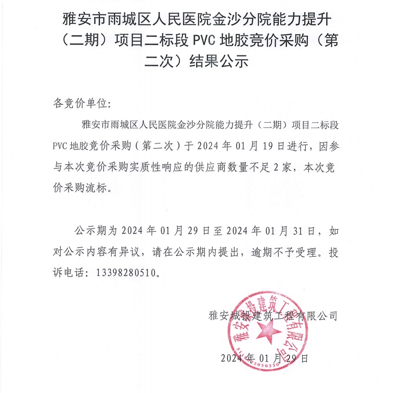 雅安市雨城區(qū)人民醫(yī)院金沙分院能力提升(二期)項(xiàng)目二標(biāo)段PVC地膠競價采購(第二次)結(jié)果公示