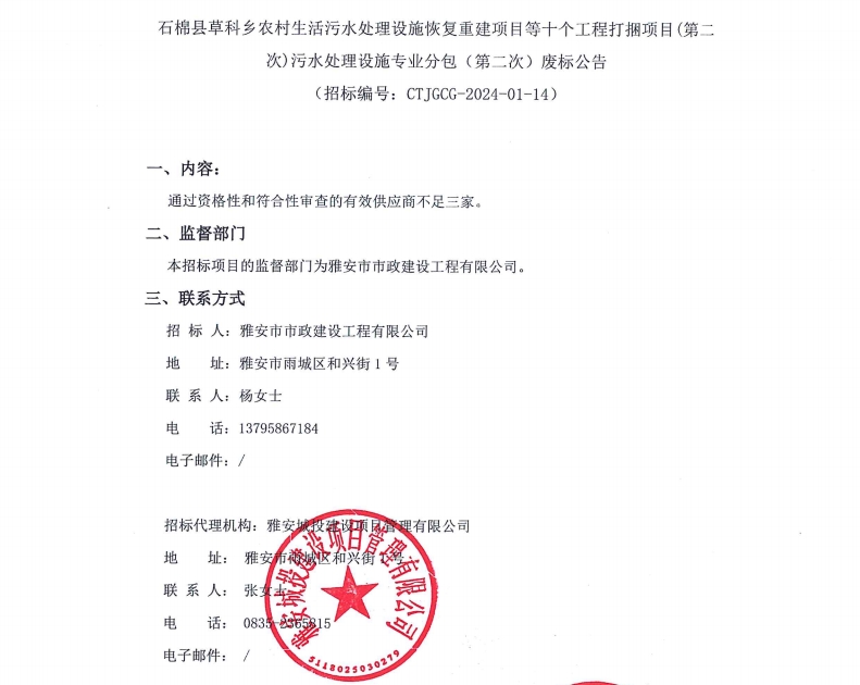 石棉縣草科鄉(xiāng)農(nóng)村生活污水處理設(shè)施恢復(fù)重建項目等十個工程打捆項目(第二次)污水處理設(shè)施專業(yè)分包(第二次)廢標公告