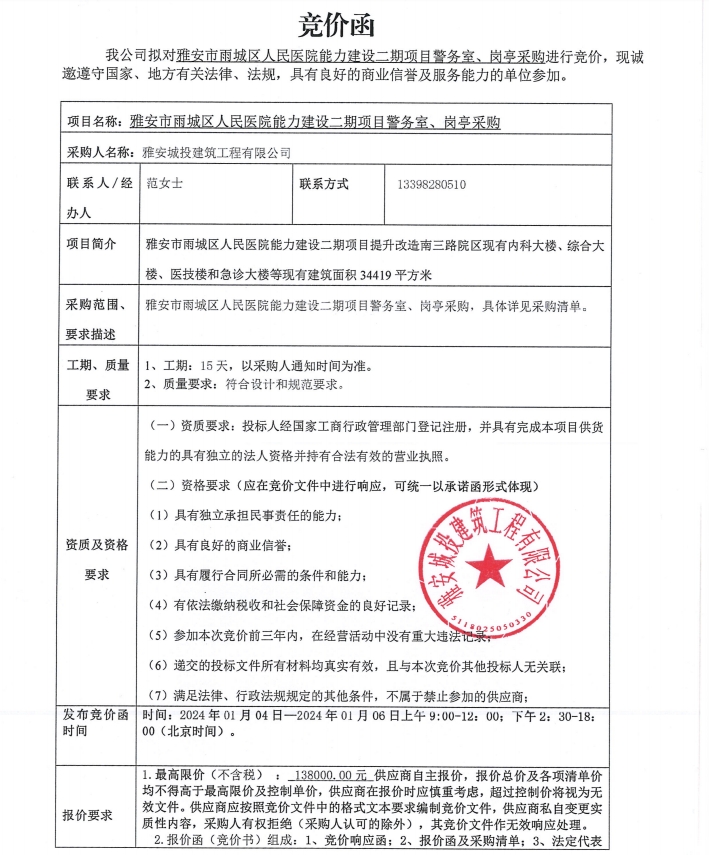 雅安市雨城區(qū)人民醫(yī)院能力建設(shè)二期項(xiàng)目警務(wù)室、崗?fù)げ少?gòu)競(jìng)價(jià)公告