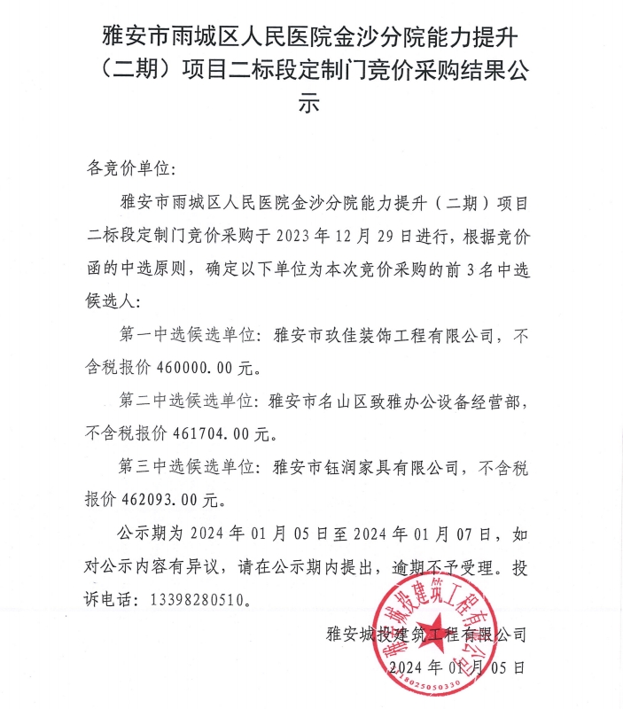 雅安市雨城區(qū)人民醫(yī)院金沙分院能力提升(二期)項目二標段定制門競價采購結(jié)果公示