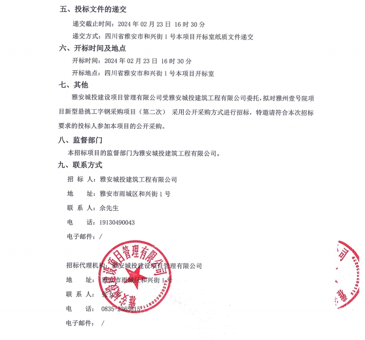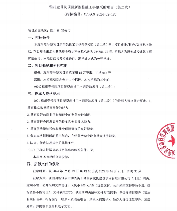 雅州壹號(hào)院項(xiàng)目新型懸挑工字鋼采購(gòu)項(xiàng)目(第二次)公告