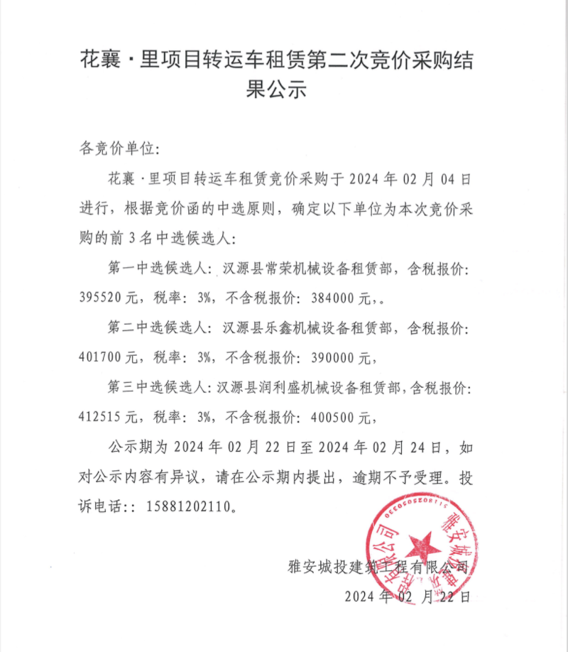 花襄·里項(xiàng)目轉(zhuǎn)運(yùn)車租賃第二次競(jìng)價(jià)采購結(jié)果公示