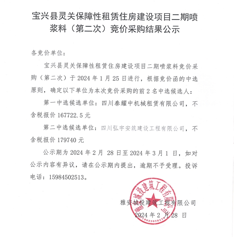 寶興縣靈關保障性租賃住房建設項目二期噴漿料(第二次)競價采購結果公示
