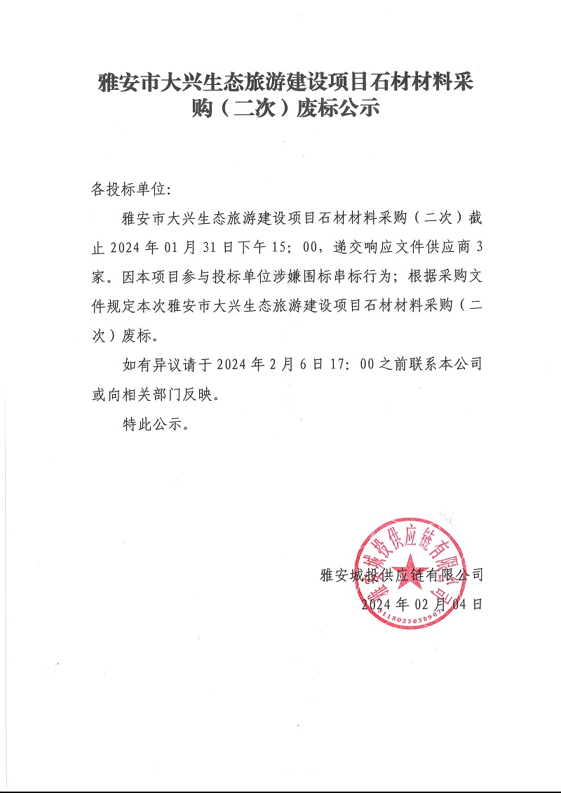 雅安市大興生態(tài)旅游建設項目石材材料采購(二次)廢標公示
