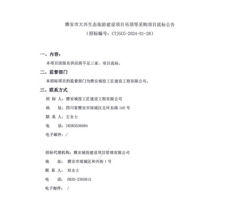雅安市大興生態(tài)旅游建設(shè)項目吊頂?shù)炔少忢椖苛鳂?biāo)公告