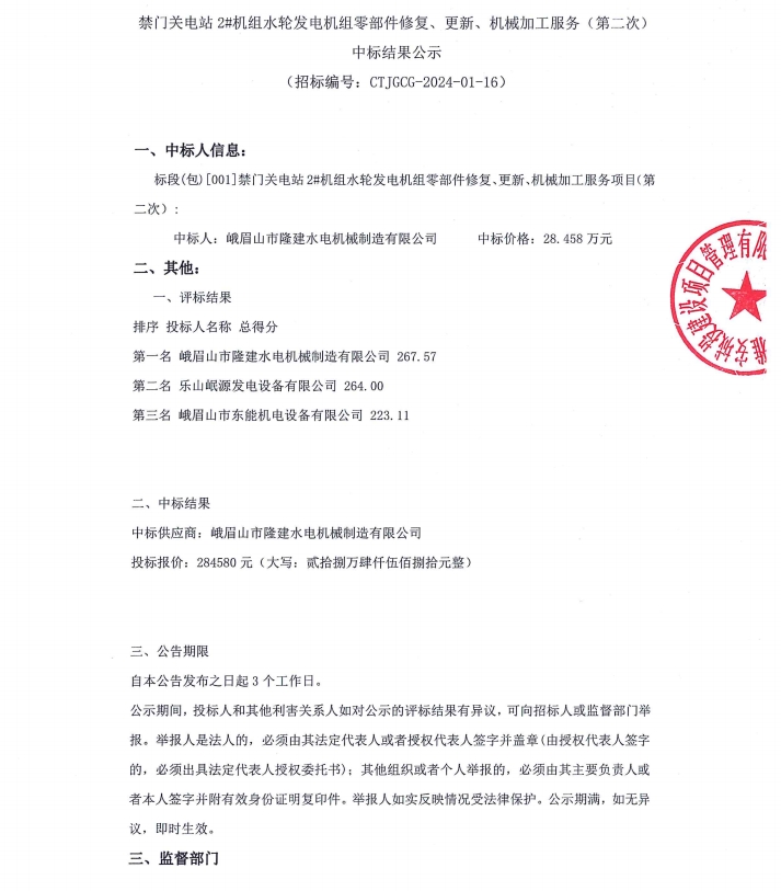 禁門關(guān)電站2#機組水輪發(fā)電機組零部件修復(fù)、更新、機械加工服務(wù)(第二次)中標(biāo)結(jié)果公示