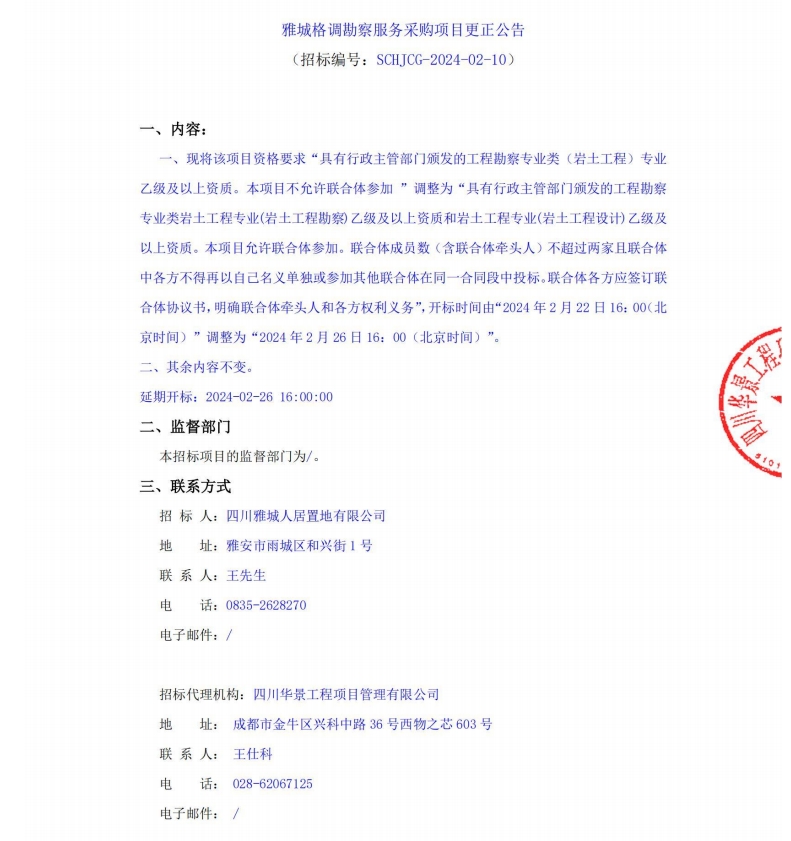 雅城格調(diào)勘察服務(wù)采購項目更正公告
