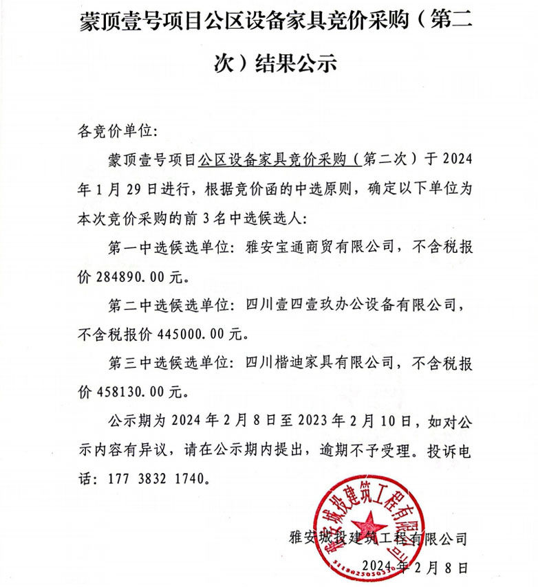 蒙頂壹號項目公區(qū)設備家具競價采購(第二次)結果公示