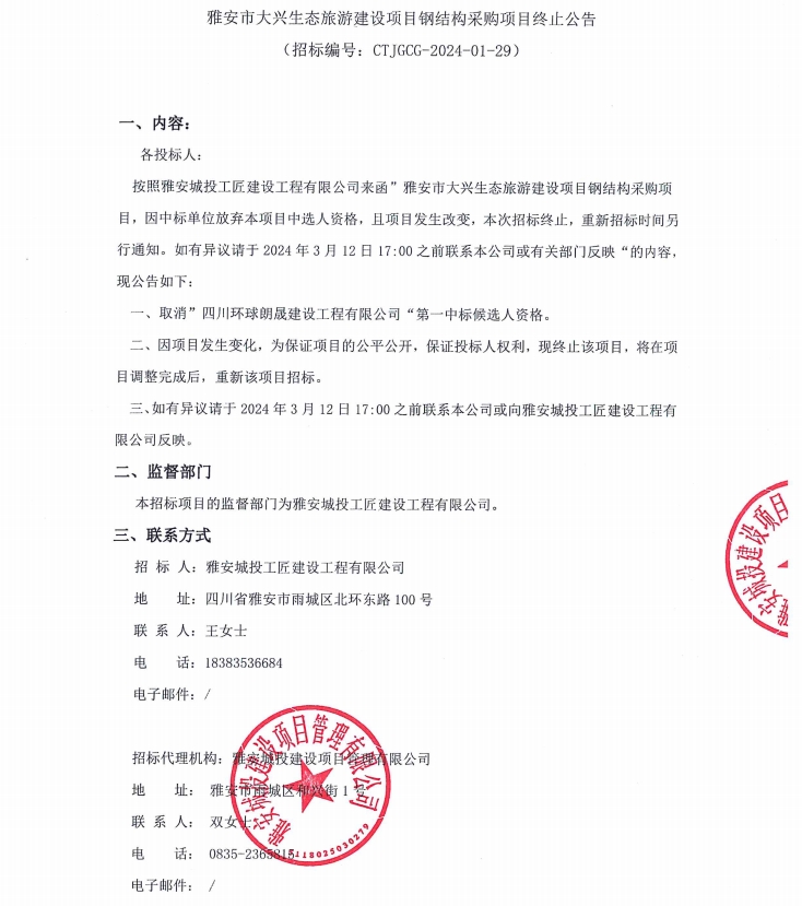雅安市大興生態(tài)旅游建設項目鋼結構采購項目終止公告