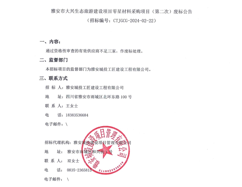 雅安市大興生態(tài)旅游建設(shè)項目零星材料采購項目(第二次)廢標(biāo)公告