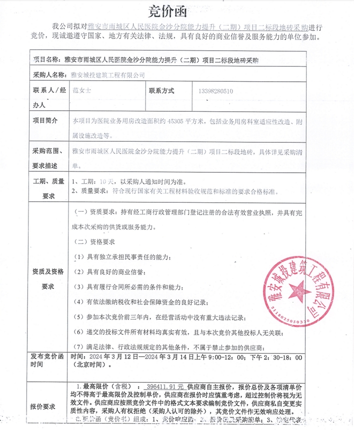 雅安市雨城區(qū)人民醫(yī)院金沙分院能力提升(二期)項(xiàng)目二標(biāo)段地磚采購競價(jià)公告