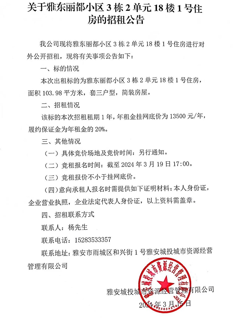 關(guān)于雅東麗都小區(qū)3棟2單元18樓1號住房的招租公告