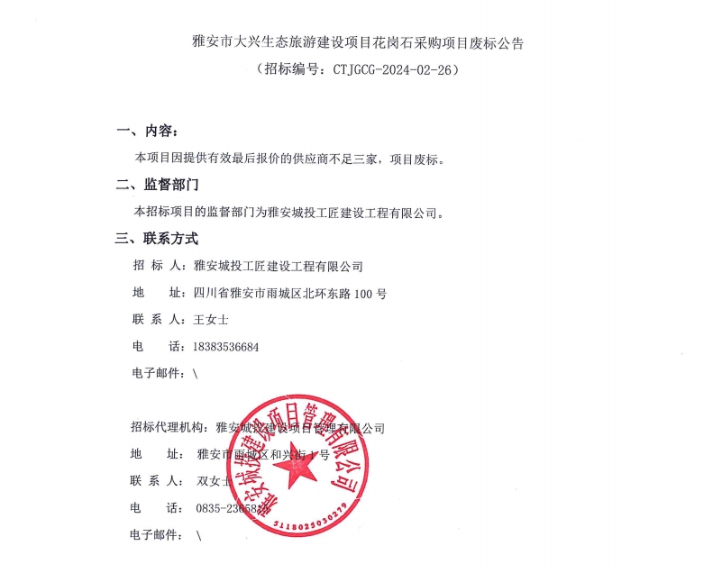 雅安市大興生態(tài)旅游建設(shè)項(xiàng)目花崗石采購(gòu)項(xiàng)目廢標(biāo)公告