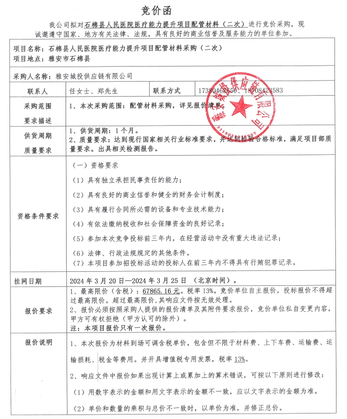 石棉縣人民醫(yī)院醫(yī)療能力提升項目配管材料(二次)競價公告