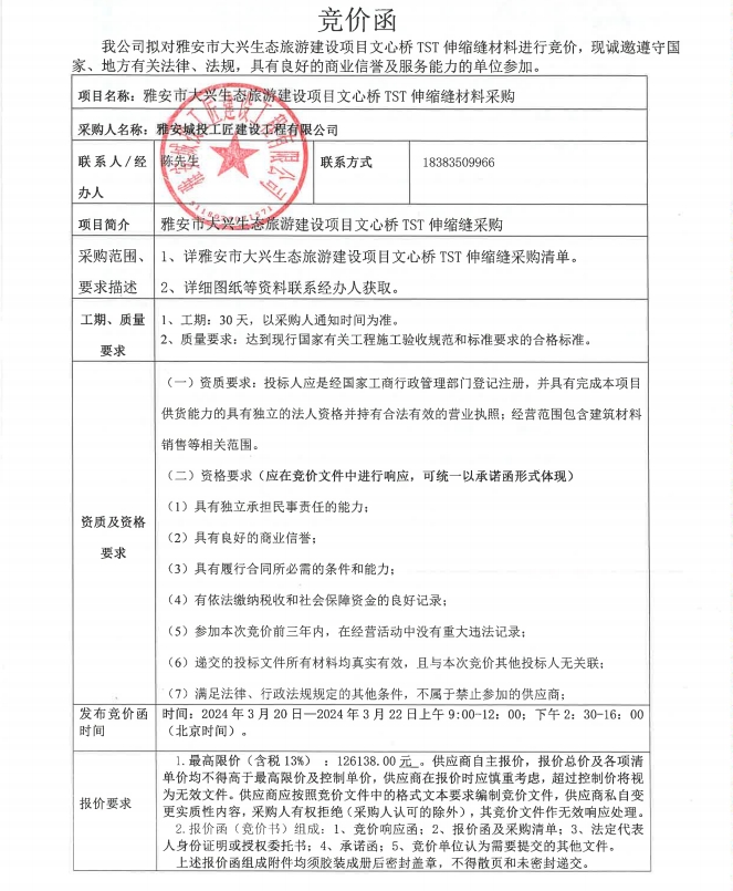 雅安市大興生態(tài)旅游建設(shè)項(xiàng)目文心橋TST橋梁伸縮縫材料采購競價公告