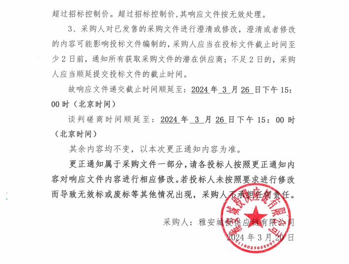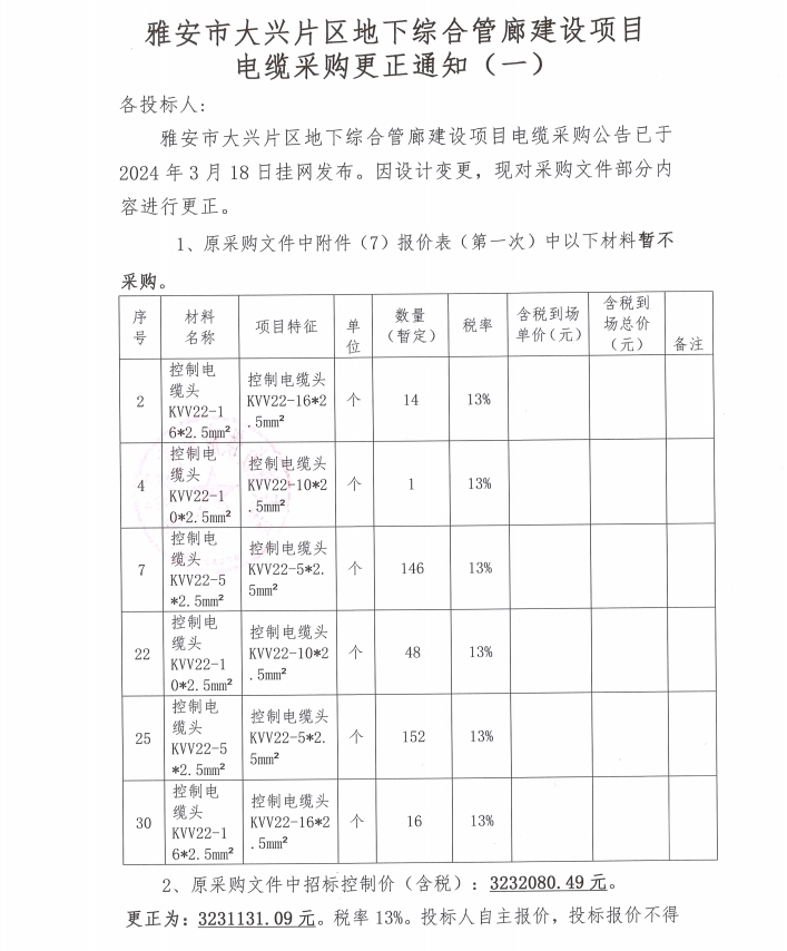 雅安市大興片區(qū)地下綜合管廊建設(shè)項(xiàng)目電纜采購(gòu)更正通知(一)
