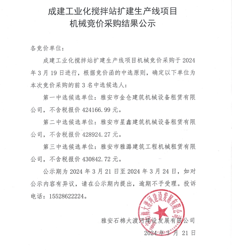 成建工業(yè)化攪拌站擴建生產(chǎn)線項目機械競價采購結(jié)果公示